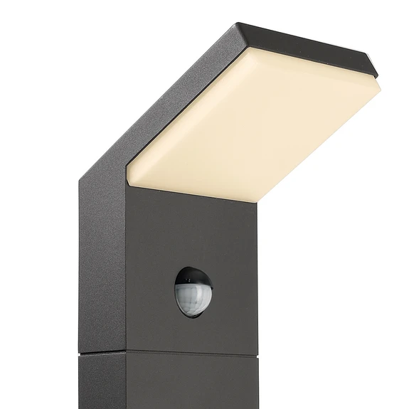 Lampadar modern Tucanae cu luminoasă LED de culoare gri închis metalic, cu control prin senzor Lampadarul Tucanae cu luminoasă LED cu senzor, fabricat din aluminiu, se integrează perfect în instalațiile moderne de exterior, cu finisajul său gri închis metalic (RAL 840-M) și designul dreptunghiular. Secțiunea superioară, înclinată, este prevăzută cu o unitate LED alb cald care emite lumină printr-un difuzor alb. Datorită detectorului de mișcare și a senzorului de lumină naturală, lumina poate fi aprinsă și stinsă automat, după cum este necesar - Grad de protecție: IP54 - Prag crepuscular reglabil - Senzor de mișcare: rază de acțiune max. 10 m, unghi de detecție 120°