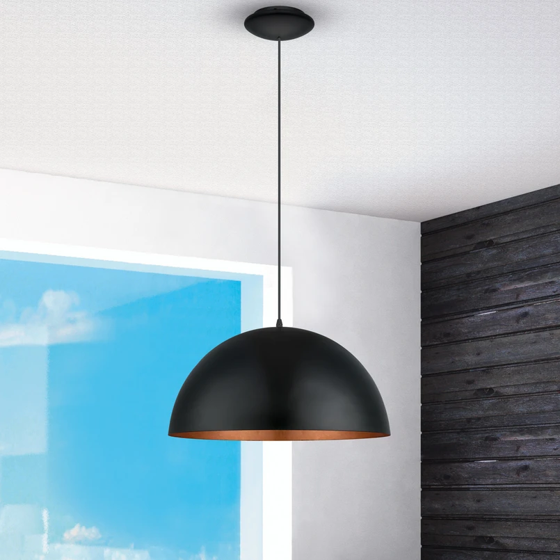 Gaetano 1 lampă suspendată, negru la exterior, cupru la interior Lampa suspendată Gaetano este prezentată în culorile trendy negru și cupru. Abajurul, care este larg deschis în partea de jos, este fabricat din metal și este vopsit în negru mat la exterior și are un finisaj cupru lucios la interior. Interiorul din cupru creează un efect de iluminare foarte cald în camerele de zi, sălile de mese sau chiar în bucătărie. Orice tip de sursă de lumină poate fi utilizată în soclul E27 din abajurul lat. Becurile cu aspect de filament sunt deosebit de decorative.