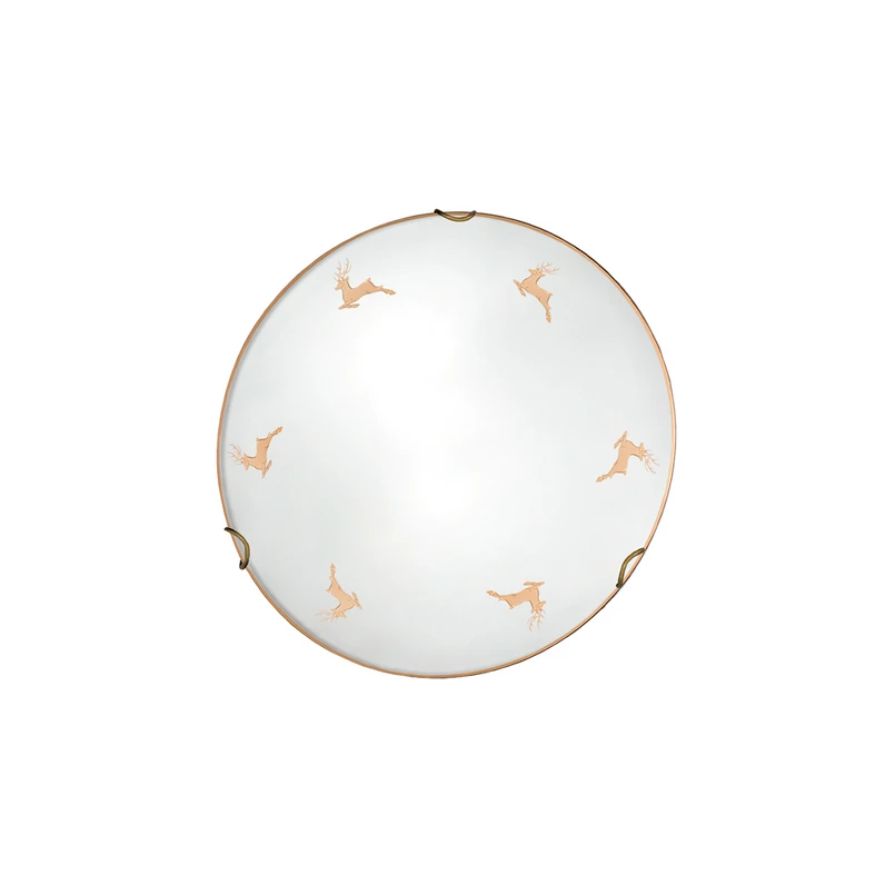 Aplica de perete Nonna este compusă dintr-o placă de montare din metal și un abajur din sticlă albă cu cerbi aurii, pictați manual. Combinația dintre sticla albă și accentele aurii conferă fiecărei încăperi o atmosferă caldă și primitoare. Perfect adaptată stilului rustic, lampa se integrează armonios în sufragerie, dining sau hol și devine un element decorativ elegant.