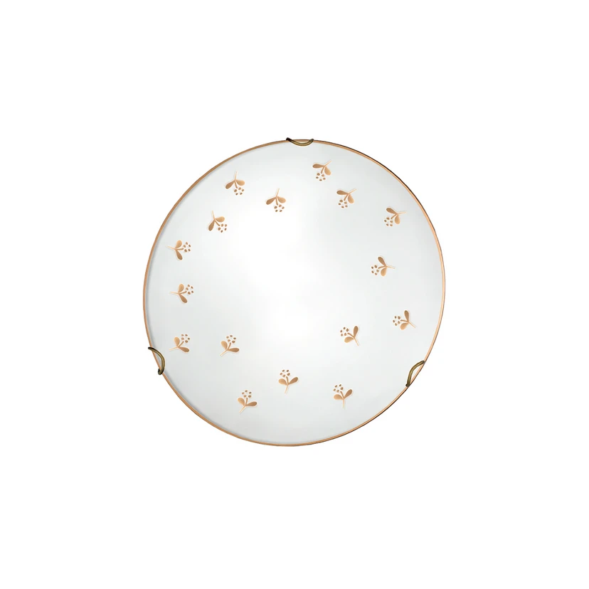 Aplica de perete Nonna combină stilul rustic al caselor de țară cu eleganța atemporală. Abajurul din sticlă albă este accentuat de un decor floral filigranat, de culoare aurie, pictat manual. Combinația armonioasă de culori alb și auriu se integrează perfect în diferite spații de locuit, precum sufrageria, sala de mese sau holul, și creează o atmosferă primitoare.