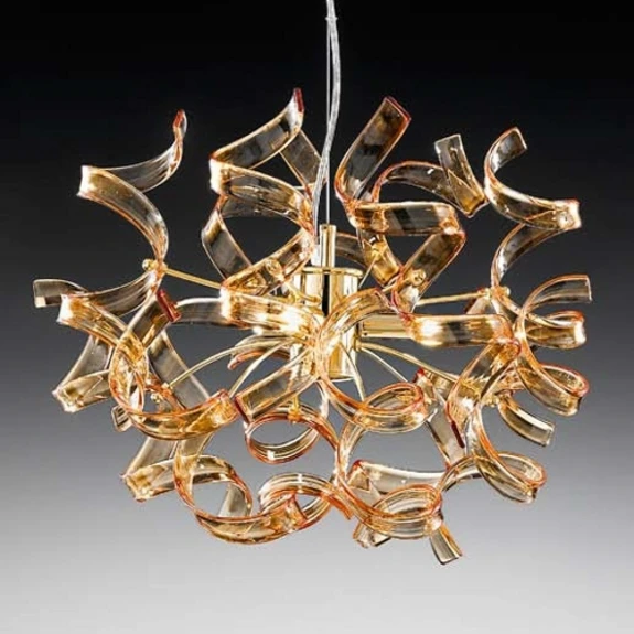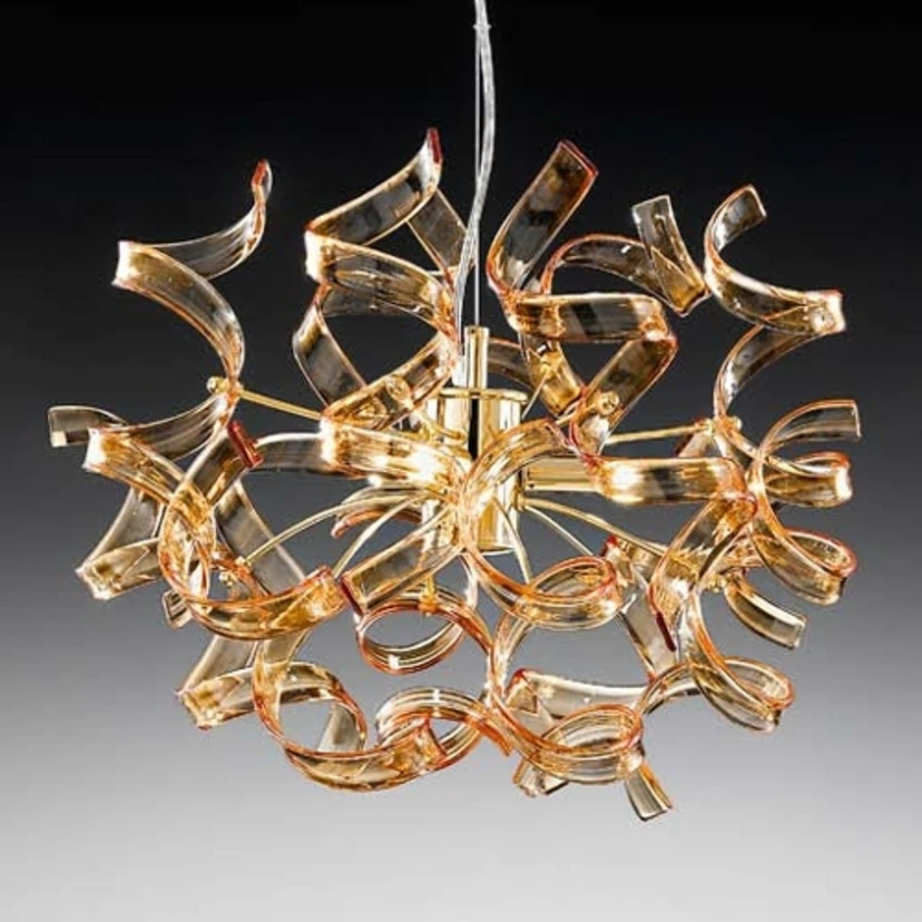Lampă suspendată AMBER - Sticla de culoarea chihlimbarului și aurul dau un ton cald de luminăÎn lampa suspendată AMBER, tije metalice emană dintr-un cadru auriu, la capetele cărora 12 elemente de sticlă de culoarea chihlimbarului se întrepătrund pentru a forma un corp de lampă oval cu un diametru de 40 cm. Trei lămpi cu halogen fac ca această combinație între un abajur de chihlimbar și culoarea aurie să strălucească într-o lumină caldă. În jurul corpului de iluminat se creează o atmosferă confortabilă. Domeniul de livrare nu include becurile.