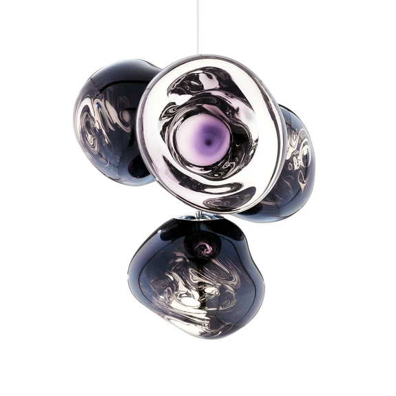 Încântătoare lampă suspendată LED Melt Small - 4 becuri Aspectul lămpii suspendate LED Melt Small este foarte neobișnuit chiar și atunci când este stinsă. Patru abajuri din policarbonat metalizat, lăcuit colorat, ies din tije metalice, dând impresia de sticlă topită. De aici provine numele Melt, deoarece cuvântul englezesc "melt" înseamnă a topi. De îndată ce iluminatul cu LED-uri este pornit, se dezvăluie întregul farmec al acestei surse de lumină extravagante. Lumina radiază apoi în toate direcțiile și îmbogățește camera cu o atmosferă de iluminare reflectorizantă și confortabilă - dimabil din exterior - cablu transparent