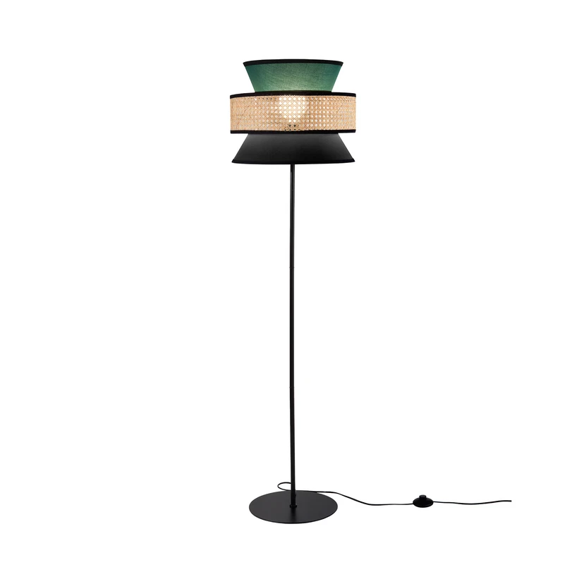 Lampadar Gazebo combină materiale naturale precum ratanul și țesătura cu un cadru metalic elegant. Combinația de culori verde, negru și natural conferă designului o estetică atemporală, care se integrează perfect în diferite spații de locuit, precum sufrageria sau dormitorul.