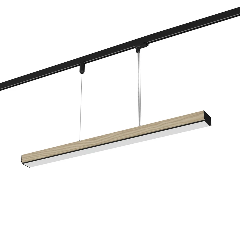 Aparat de iluminat suspendat cu LED alungit Timba pentru șină trifazată Aparatul de iluminat suspendat cu LED Timba cu adaptor pentru șină trifazată este o soluție de iluminat durabilă și decorativă. Corpul din lemn de frasin cu design dreptunghiular conferă corpului de iluminat un aspect modern și elegant și creează o atmosferă plăcută în spații private sau publice. În plus, corpul de iluminat este extrem de ușor de întreținut și nu emite nici radiații UV, nici căldură. Managementul termic inovator este posibil datorită profilului de răcire din aluminiu integrat. Suspensia din sârmă reglabilă pe înălțime este echipată cu un adaptor de cale trifazat DALI (ONETrack), care permite o reglare flexibilă și individuală a iluminatului. Echipamentul de control (convertor LED) este integrat și dispune de variator DALI. Acest lucru permite reglarea iluminatului în funcție de necesități și economisește costurile de energie. În general, corpul de iluminat suspendat cu LED Timba este o soluție de iluminat sustenabilă și eficientă, care impresionează prin designul său modern, funcționalitate și flexibilitate - lemnul utilizat este netratat și, prin urmare, susceptibil la ulei și murdărie. Pot apărea abateri ale granulației.