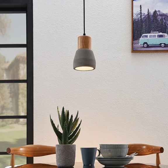 Lampă suspendată rotundă din beton Margot cu decor din lemnAceastă lampă suspendată are dimensiuni compacte și combină betonul cu aspect industrial cu expresia caldă a lemnului. Prin urmare, corpul de iluminat poate fi integrat în stiluri industriale, precum și prezentat împreună cu stiluri de viață scandinave. Ideală este montarea deasupra unei mese sau a unui tejghea - cu plăcere, mai multe corpuri de iluminat la rând - deoarece emisia de lumină se face numai în jos datorită betonului opac.