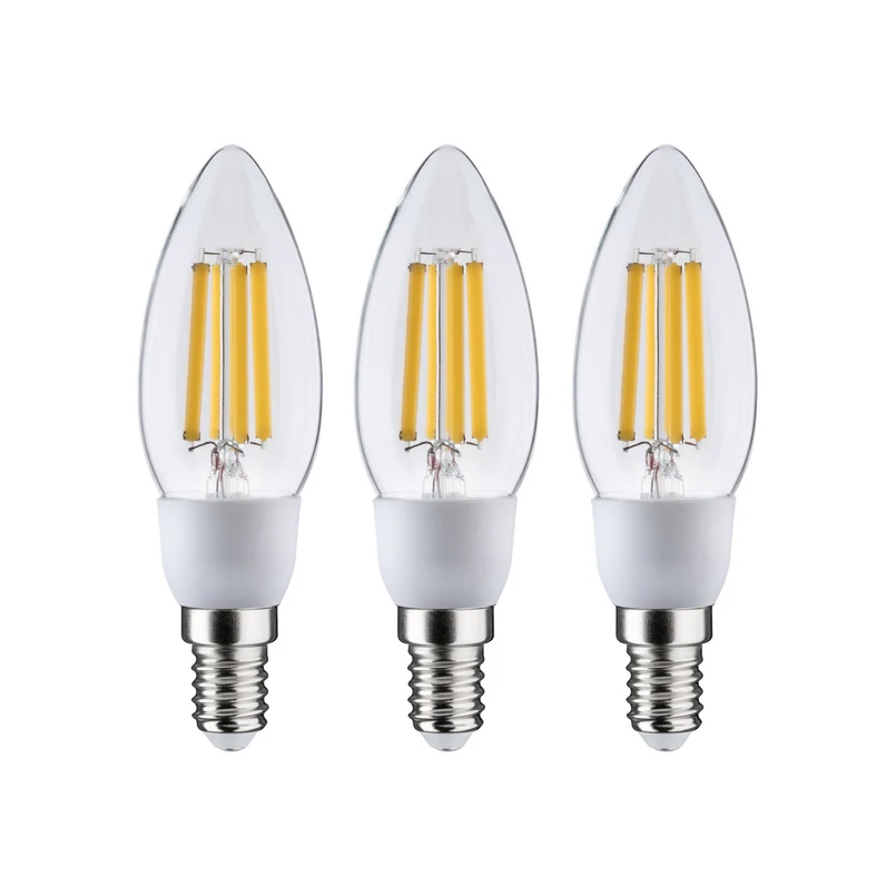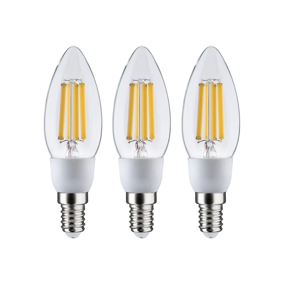 set de 3 lămpi cu lumânări LED E14 cu 2,5 wați din seria Eco-Line Lămpile ultra-eficiente Eco-Line de la Paulmann combină inovația cu durabilitatea. Datorită consumului de energie cu 60% mai mic și a duratei de viață semnificativ mai mari în comparație cu lămpile LED standard, costurile cu energia pot fi reduse semnificativ și, pe de altă parte, mediul înconjurător poate fi protejat. Lampa cu lumânare LED E14 cu optică cu filament produce o valoare luminoasă ridicată de 525 lumeni cu numai 2,5 wați și înlocuiește lămpile cu incandescență convenționale din gama de 43 de wați. Lumina lor albă caldă, în combinație cu optica, le face o opțiune ideală pentru corpurile de iluminat cu design deschis. - Set practic de 3