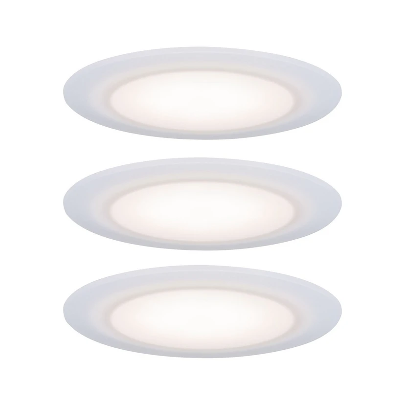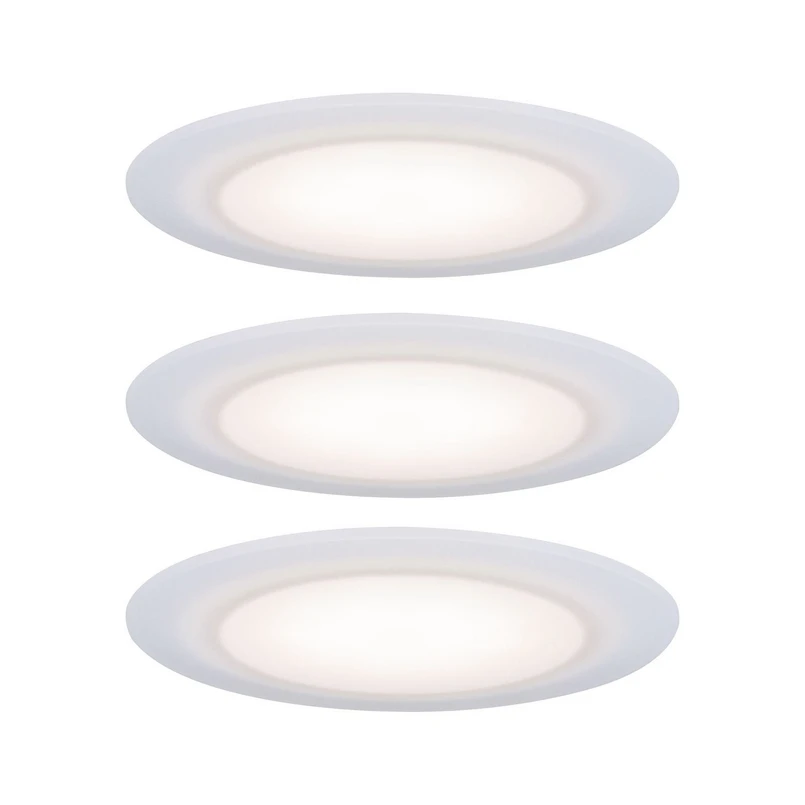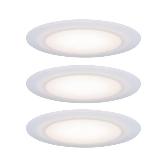 Corp de iluminat încastrat fără ramă Suon LED într-un set de 3 Corpul de iluminat încastrat fără ramă Suon LED din plastic are o suprafață albă satinată care oferă o lumină omogenă, fără strălucire și care îmbracă generos încăperea în lumină albă caldă. Atunci când este oprit, pare să se îmbine ușor cu tavanul, ceea ce îl face să se integreze foarte armonios. Datorită standardului IP44, este protejat împotriva stropirii cu apă. Suon este livrat într-un set practic de 3 și luminozitatea sa poate fi reglată și cu ajutorul unor variatoare selectate. - reglabil cu RC Merten MEG 5136-0000, RLC Müller Paladin 873 030 LED
