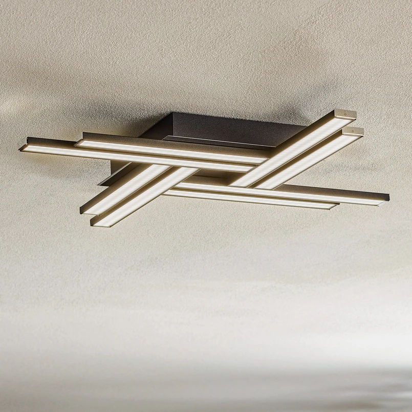 Plafonieră Largo cu LED-uri negre - 8 flăcări cu telecomandă Lumina strălucitoare cu LED-uri pentru o iluminare excelentă a încăperii este asigurată de plafoniera Largo cu LED-uri, ale cărei opt elemente luminoase cu LED-uri sunt dispuse în grupuri de două de lungimi diferite pe baldachinul pătrat. Lumina este emisă pe o suprafață mare și iluminează camerele de zi și dormitoarele într-un mod foarte plăcut. Culoarea luminii alb cald contribuie decisiv la crearea unei atmosfere confortabile, telecomanda inclusă în pachetul de livrare permite un control convenabil al luminii.