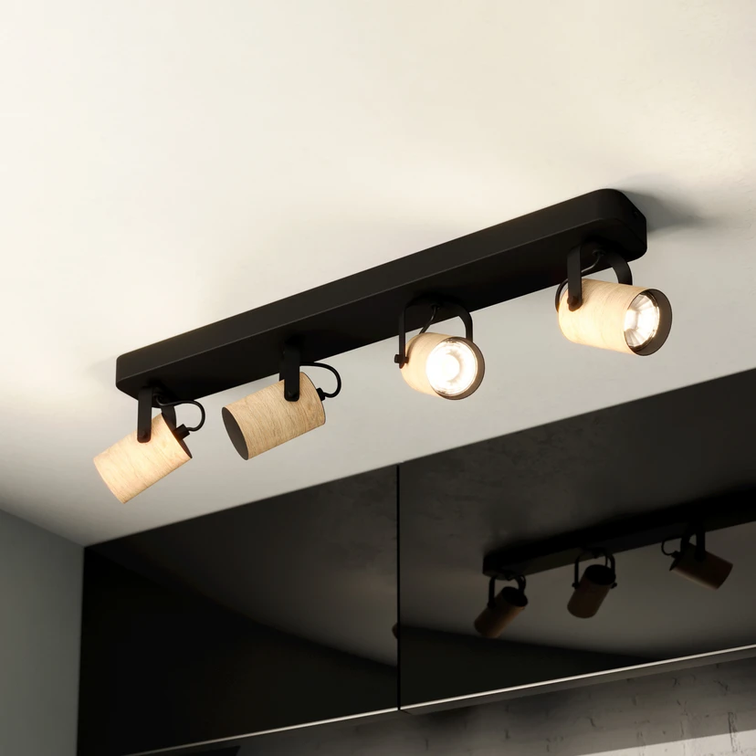 Spot de tavan Cayuca, decor negru/lemn, cu patru flăcări