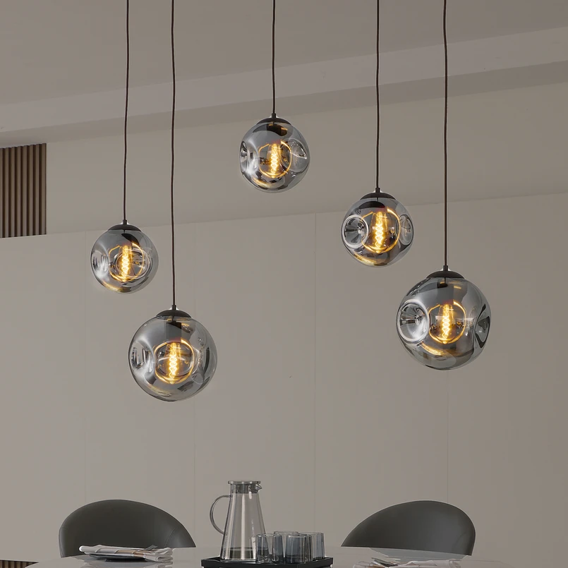 Lampă suspendată Valentina cu cinci lumini În formă de rondel cu abajururi din sticlă Lampa suspendată modernă Valentina poate fi utilizată în mod flexibil în zona de living. Datorită designului său coloristic subtil, se integrează fără efort în zona de bucătărie, sufragerie sau living, de exemplu. Lumina este emisă în jur prin abajururile de sticlă gri fumuriu și creează o atmosferă confortabilă în încăpere. Abajururile au o formă rotundă, care este aplatizată decorativ pe o parte. Acest lucru conferă lămpii suspendate un aspect deosebit. Abajururile atârnă de baldachin la înălțimi diferite. Valentina este ideală pentru a ilumina o masă lungă de living sau de luat masa.