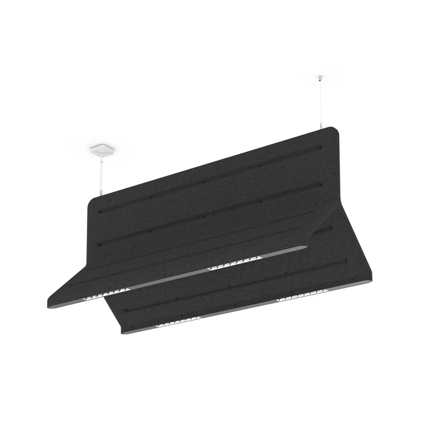 Muse Double light - corp de iluminat modern cu LED pentru locuri de muncă cu suprafață de absorbție a sunetuluiCel de-al doilea corp de iluminat Muse Double light este proiectat și optimizat pentru iluminarea locurilor de muncă de birou opuse. Este alcătuit dintr-un fleece din poliester, care este fabricat din poliester reciclat în proporție de 50 % și are, de asemenea, proprietăți de absorbție a sunetului. Construcția cu două cochilii asigură îmbunătățirea performanței acustice a corpului de iluminat. Astfel, acustica spațiilor de birouri este optimizată în mod eficient prin utilizarea corpului de iluminat suspendat Muse Double light, care asigură o bunăstare fizică și mentală, precum și un mediu de lucru liniștit. Aparatul de iluminat suspendat cu două lumini Muse este convenabil de reglat în înălțime, chiar și în timpul funcționării. Între min. 10-15 cm și max. 150 cm, suspendarea cablului poate fi reglată fără unelte, acesta fiind atașat de corpul corpului corpului de iluminat cu ajutorul unor cleme cu arc și putând fi astfel poziționat liber. LED-urile încorporate oferă lumină în culori reale pe ambele părți, sunt, de asemenea, eficiente din punct de vedere energetic, pot fi atenuate și au un reflector cromat cu aspect fațetat. - aparat de iluminat compatibil cu ecranul în conformitate cu DIN EN 12464-1- Densitatea corpului de iluminat ≥ 65° ≤ 1500 cd/m²- LED-uri: Binning inițial ≤ 3 MacAdam