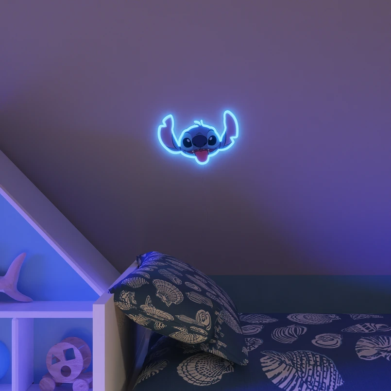 Lampă de perete Disney cu chipul lui Stitch Imaginea cu neon LED din ediția Disney de la Yellowpop luminează camera și starea de spirit în același timp. În această atracție pentru ochi, decorarea modernă a peretelui și sursa de lumină sunt combinate într-unul singur și permit fanilor Disney mari și mici să se scufunde în amintirile din filme. Lampa de perete Stitch are un tub de neon cu LED eficient din punct de vedere energetic și o placă acrilică reciclată. Datorită cablului USB-A integrat, imaginea iluminată poate fi conectată ușor și direct la un adaptor de rețea (fără excepție) pentru alimentarea cu energie electrică. Iluminatul LED Disney poate fi montat rapid și ușor cu ajutorul suspensiei integrate și conferă imediat camerei un nou aer jucăuș. Adaptorul de rețea, precum și materialul de montaj nu sunt incluse în volumul de livrare: - tablou modern de iluminat cu LED în ediția Disney ca punct de atracție pentru propria locuință - cablu USB-A cu întrerupător on/off - pentru utilizare este necesar un adaptor de rețea de cel puțin 5 wați (nu este inclus)